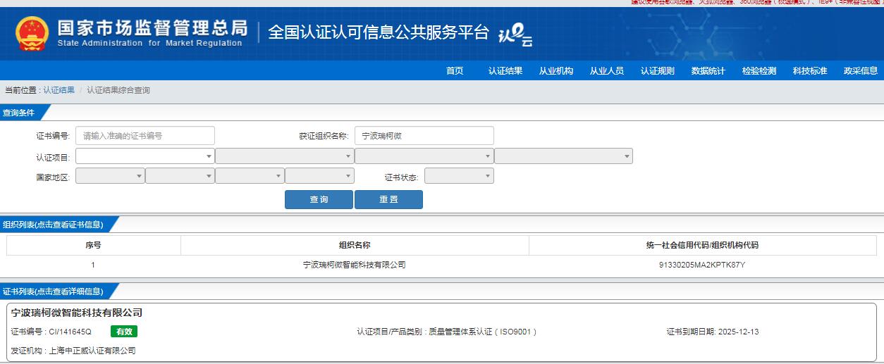 熱烈祝賀寧波瑞柯微智能科技有限公司通過ISO9001認證