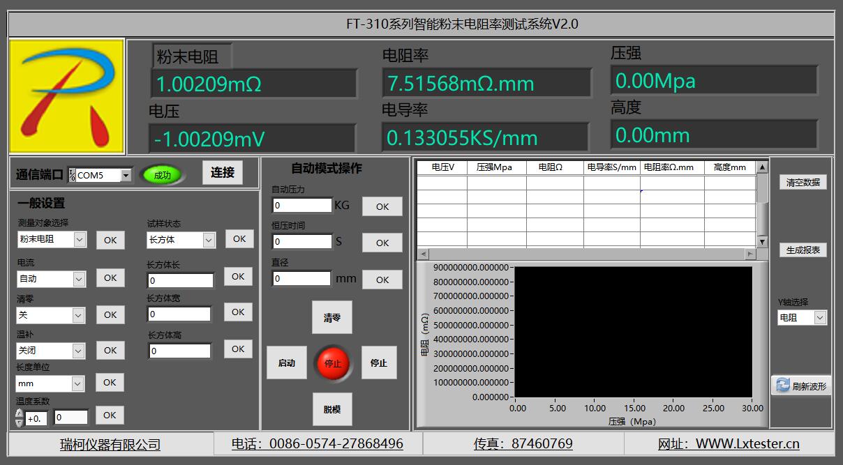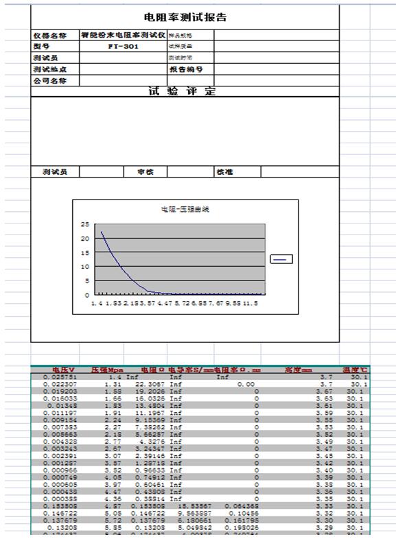 電阻值、電阻率、電導率值、溫度、壓強值、單位自動換算、 橫截面積、厚度、曲線圖譜、壓實密度、生成報表等. |
