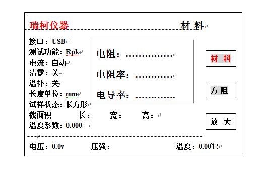液晶顯示:電阻、電阻率、方阻、溫度、單位換算、溫度系數(shù)、電流、電壓、探針形狀、探針間距、厚度、電導(dǎo)率 |