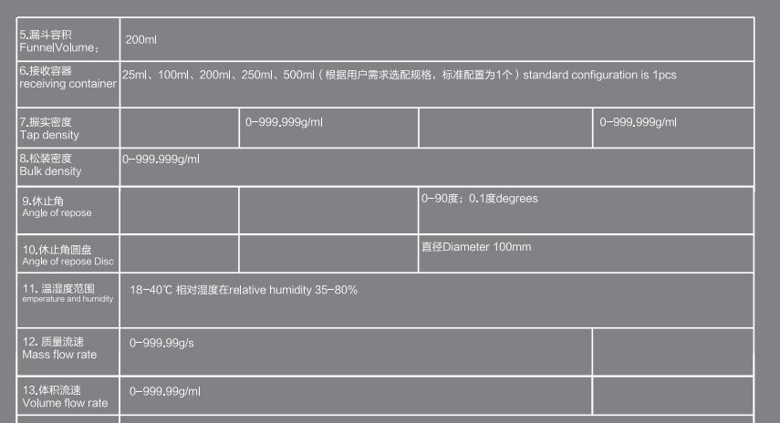 提供中文或英文語言版本選擇,,自動測量控制系統(tǒng),分析粉末和顆粒物料,采用光電測量系統(tǒng)自動測量數(shù)據(jù),數(shù)據(jù)由集成電路系統(tǒng)處理并分析評定物料的流動性狀態(tài),反映粉體和顆粒的流動能力和密度數(shù)據(jù)為料倉設計。