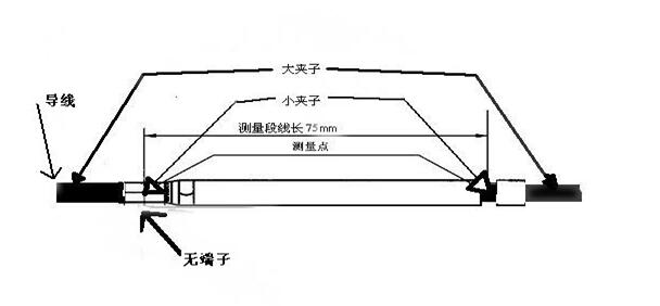 如上示兩圖中,圖1導線首端帶有端子,測量75mm長帶端子導線的兩端壓降,記錄數(shù)據(jù)備用;圖2中導線不帶端子,直接測量75mm長導線的兩端壓降,記錄數(shù)據(jù);用圖1中測得的壓降減去圖2中測得的壓降即為被測端子的壓降。